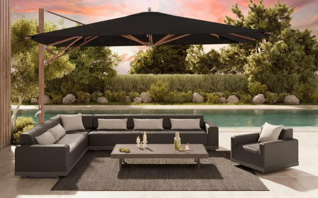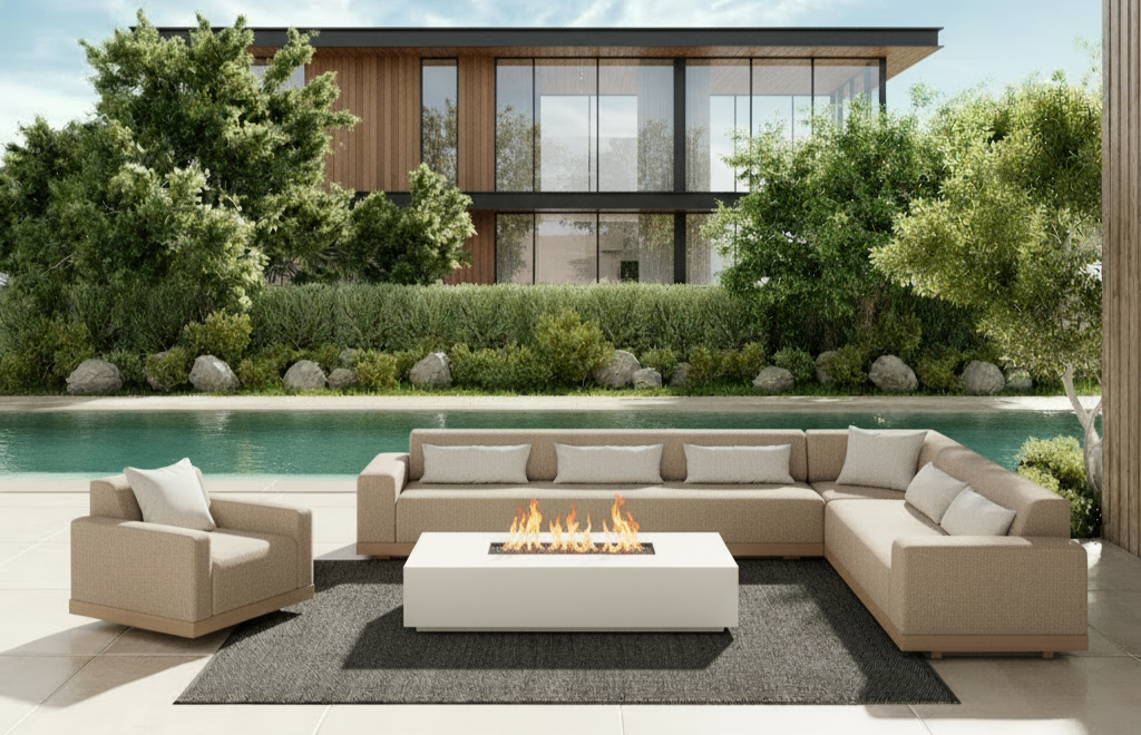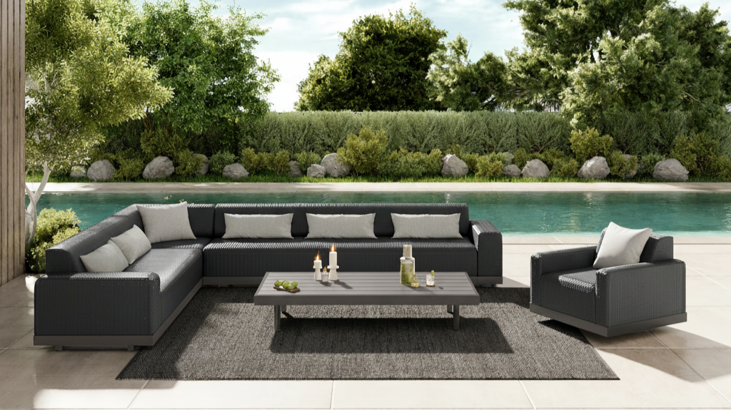 the Grande Collection boasts a low, sleek profile with built-in cushions, offering a modern twist on classic design. The rich, variegated Barley and Coal weaves cover the reticulated foam, ensuring exceptional comfort and quick drying times. With modular pieces, including a chaise lounge and multiple table options, the configuration possibilities are seemingly endless.