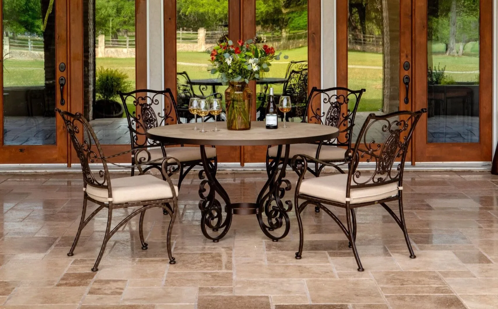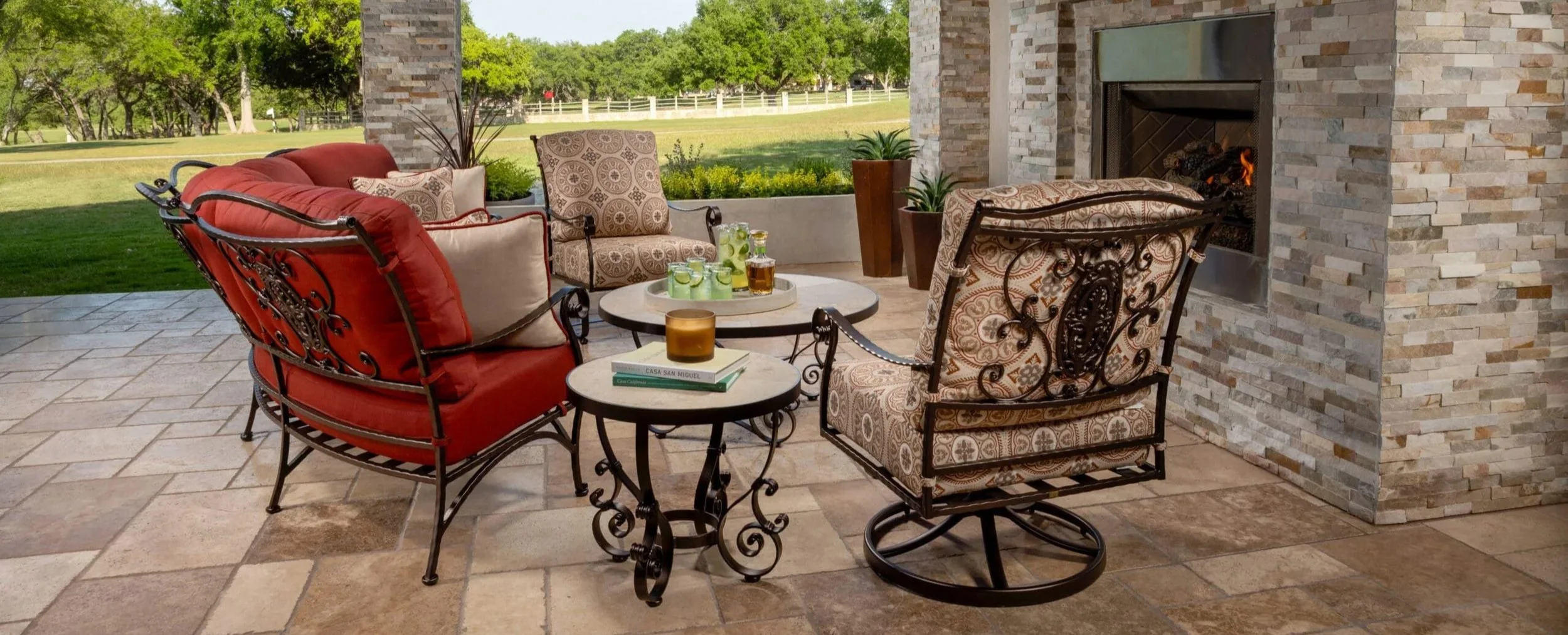 HAND CRAFTED IN THE HILL COUNTRY BY OW LEE. THE San Cristóbal collection reflects the romance of Spanish Baroque design with graceful curves, hammered bar tubing, and hand-forged scroll-work. Crafted with exceptional artistry, this line includes dining, counter, and bar seating, plus lounge chairs, a loveseat, sofa, sectional, ottoman, chaise, and coordinating table bases—available exclusively at Home & Patio in San Antonio.