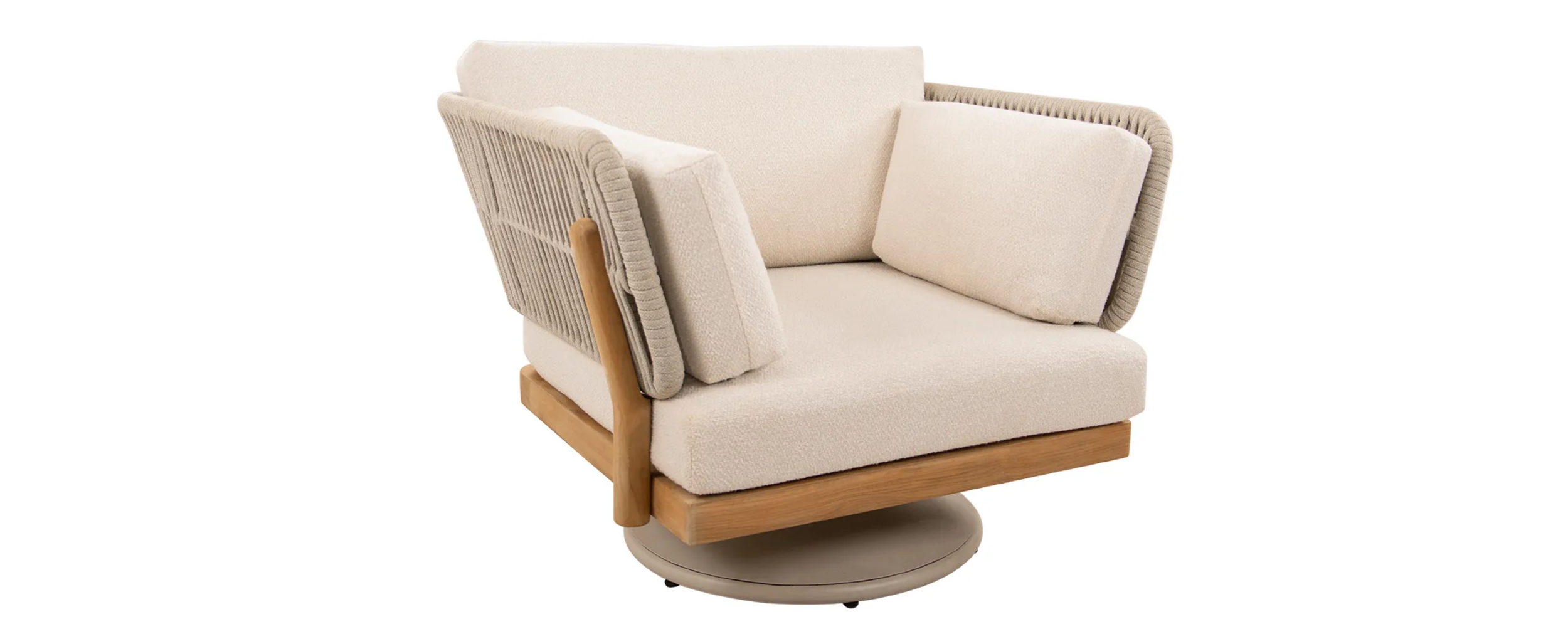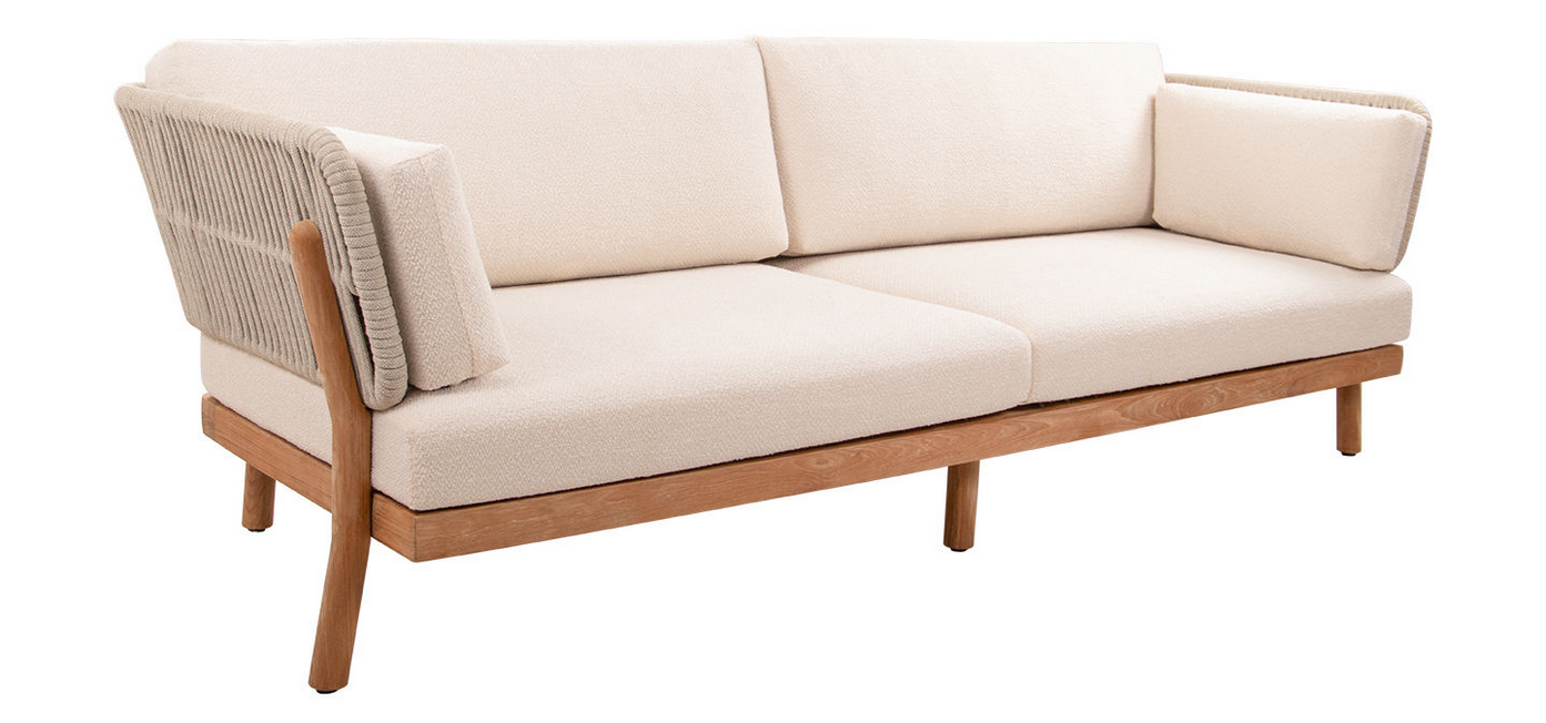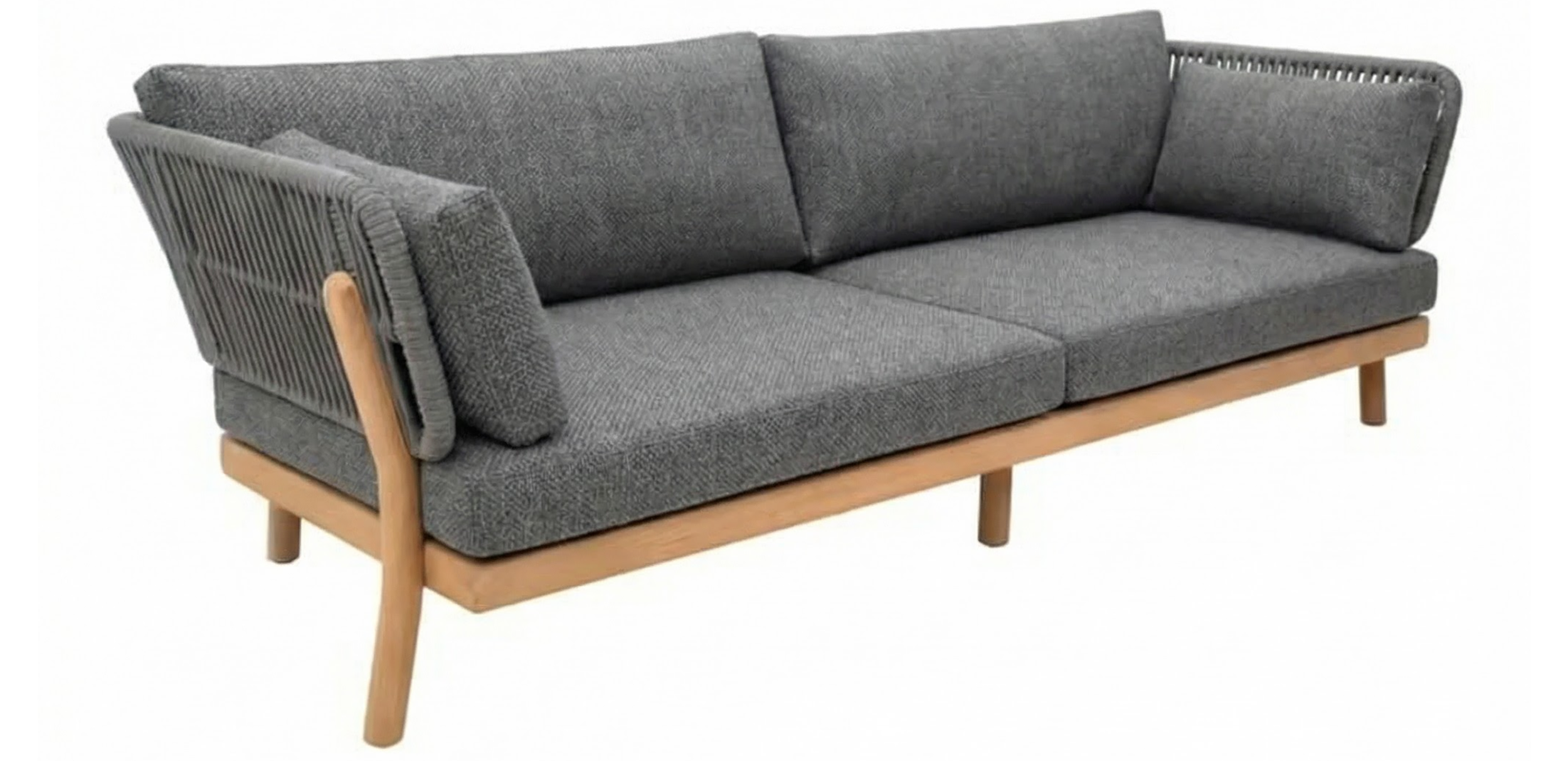 Strata by Loden blends extruded aluminum, teak, and rope for a sleek, modern look with comfort at its core. Designed with supportive multi-density foam, it offers both style and relaxation. Exclusive to Home & Patio, Strata is available in two colorways: Linen & Cloud or Charcoal & Slate.